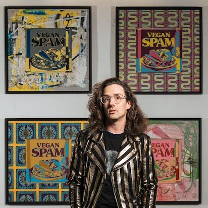Known for playful, thought-provoking works like his iconic Vegan Spam collection, he combines pop culture symbols with intricate stencilling and spray paint to create immersive, unsettling, and visually striking pieces. Influenced by Bristol’s street art scene, Banksy, and Warhol, Agnew’s latest exhibition transforms everyday symbols into reflections on value, excess, and survival.